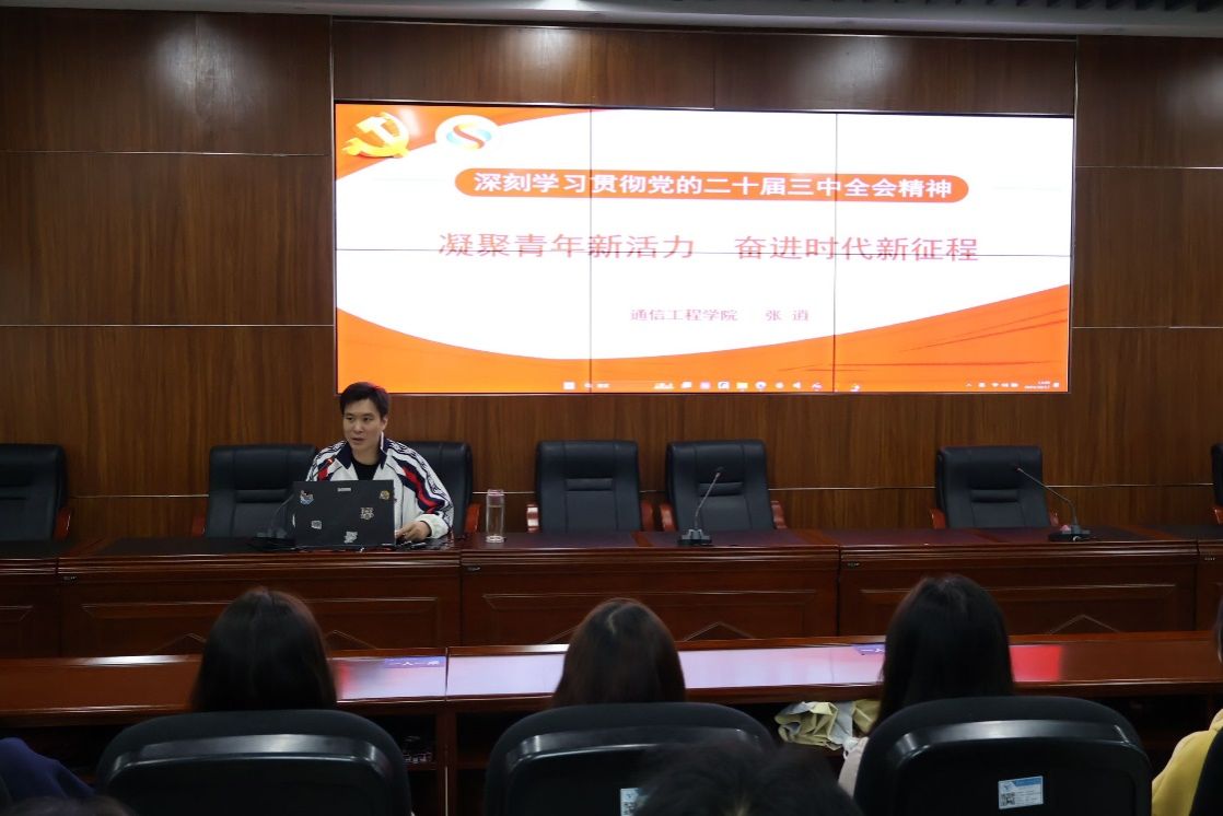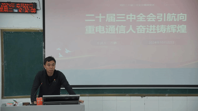为通信学子点亮前行之路,激励他们在新时代为国家通信事业贡献力量,展现当代老员工的责任与担当,2024年10月17日下午13: 00,通信工程公司党总支 党员流动服务站张逍老师在智联楼B座B307会议室召开主题为"凝聚青春新活力,奋进时代新征程"的10月思政大讲堂。首先,张逍老师围绕党的二十届三中全会展开讲解。在背景方面,他指出当前处于以中国式现代化全面推进强国建设、民族复兴伟业的关键时期,国际形势复杂、国内发展面临诸多挑战,......