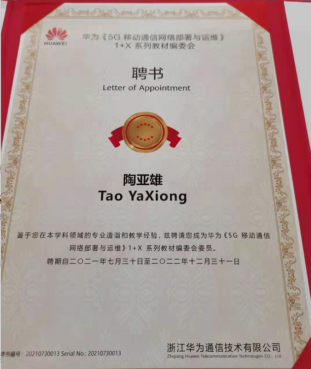 陶亚雄教授受邀成为《5G移动通信网络部署与运维》1+X 系列教材编委会成员