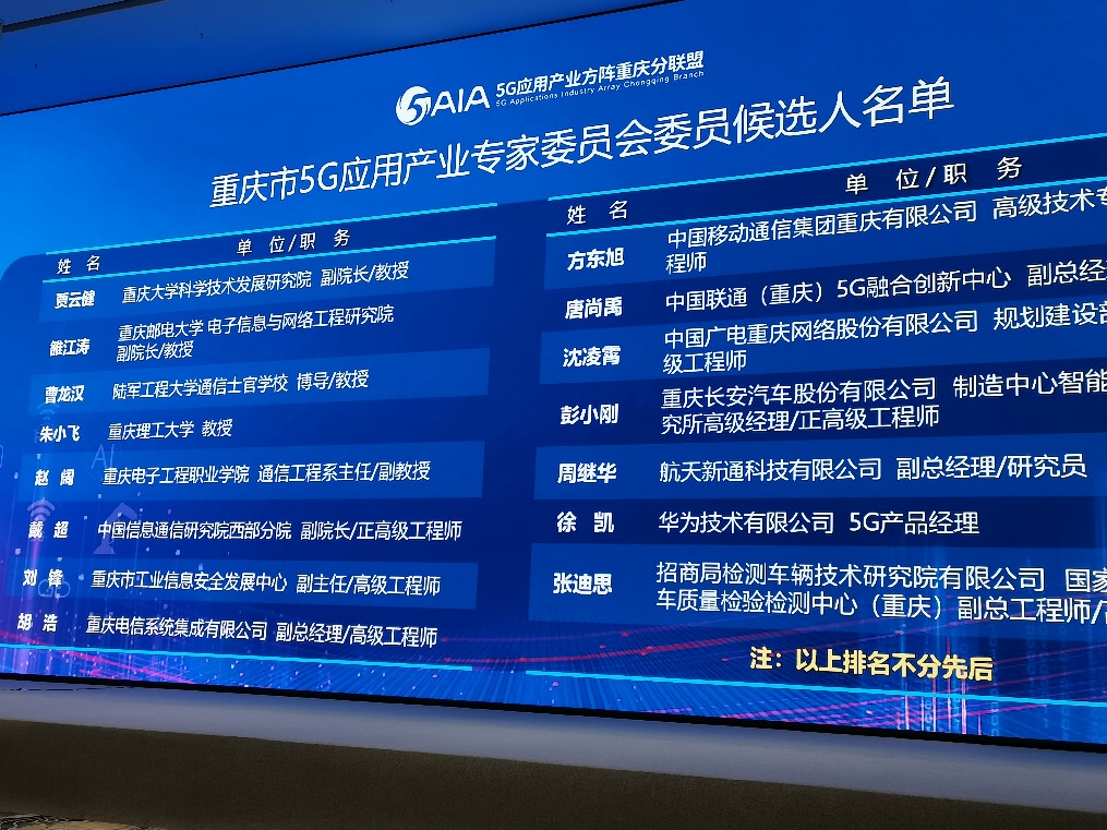 重庆市5G应用专家委员会通过单位推荐、专家自荐等方式从120名专家库成员通过投票方式选举产生,由来自重庆大学、重庆邮电大学等一流高校,以及中国移动、中国联通、中国电信等行业一流企业的专家共计15人组成。