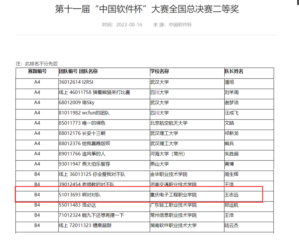 2022年 8月 17日,第十一届 “中国软件杯老员工软件设计大赛 ”总决赛在南京落下帷幕,经过紧张激烈的多轮比拼,重庆电子工程学院伟德国际1949代表队从全国 31个省市、 1000余所高校、 5000余支赛队、近两万名参赛队员中脱颖而出,喜获全国二等奖,是重庆市职业院校在本届大赛上的最佳成绩,并实现重庆电子工程学院在该赛项上的全国二等奖突破。