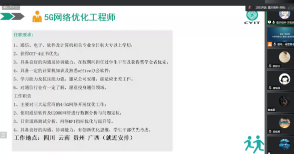 此次“5G网络优化工程师”订单班是面向重庆信科通信工程有限公司5G网络优化工程师岗位而定向开办。开办仪式上,企业工程师苏松对重庆信科通信工程有限公司发展历程、服务区域、信息化业务、5G网络优化工程师岗位任职要求与工作职责、工资待遇、员工发展空间等做了详细介绍,并与学员进行了积极互动并回答了相关问题。