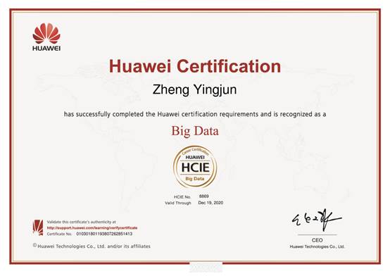 技术面试,是华为认证考试里面众所周知的最难一关,尤其是大数据的HCIE,这是华为技术有限公司在2018年新增的认证项目,面试包含HCIE-Big Data内所有知识点,这一新技术领域很难找到有效的参考复习资料,全凭面试者在日常学习中的积累、领悟。郑英俊同学不惧困难,查阅了大量资料和工程文档,仔细梳理学习过的知识,反复参详实验过程和内容数据,终于在201812月底通过面试,顺利取得HCIE-BigData证书,成为公司在校生考取华为大数据专家级认证第一人,也是重庆市高校员工HCIE-Big Data第一人。