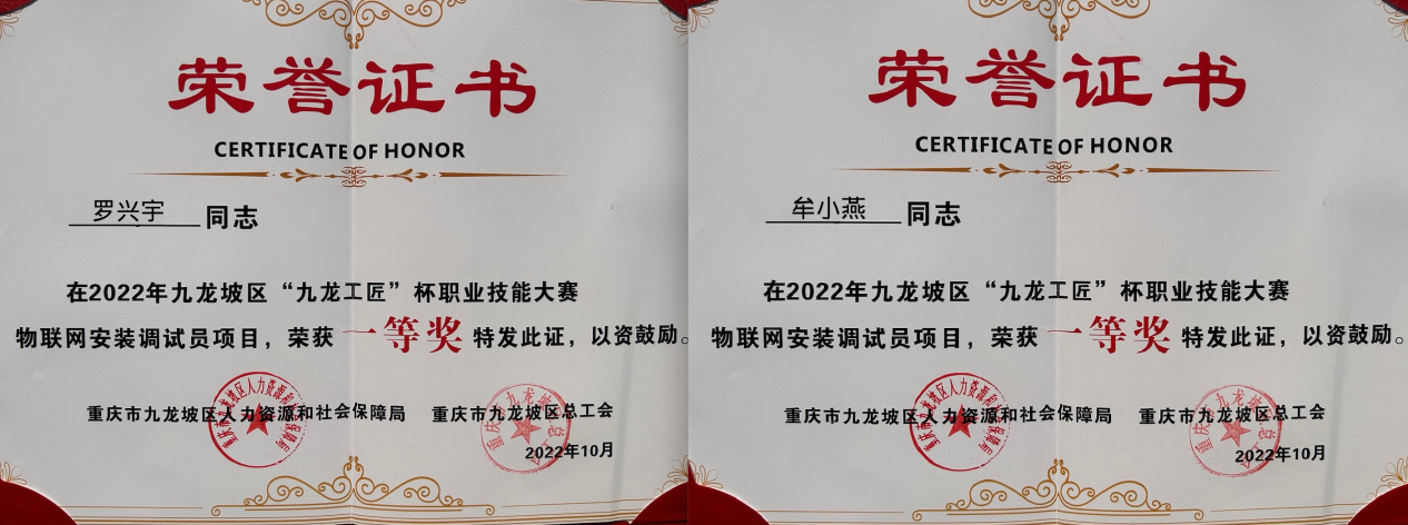 金秋十月,丹桂飘香。伟德国际1949老师在2022年九龙坡区“九龙工匠”杯职业技能大赛物联网安装调试员项目中取得优异成绩,其中罗兴宇、牟小燕两位老师斩获教师技能比赛一等奖,冉锋力教师荣获三等奖。