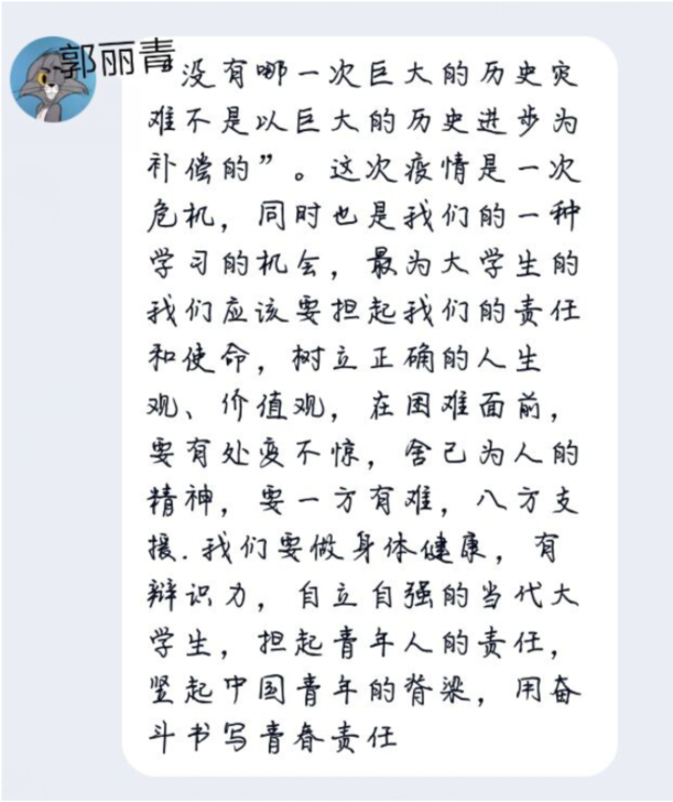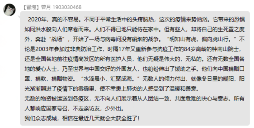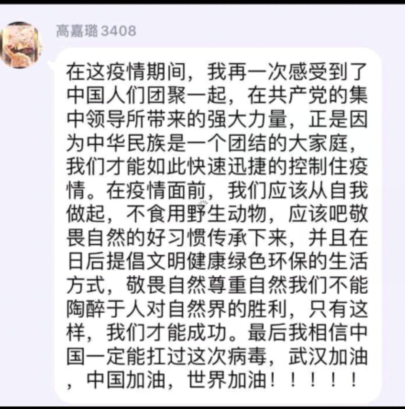同时,也有同学对本次抗疫战争表达了自己的想法: