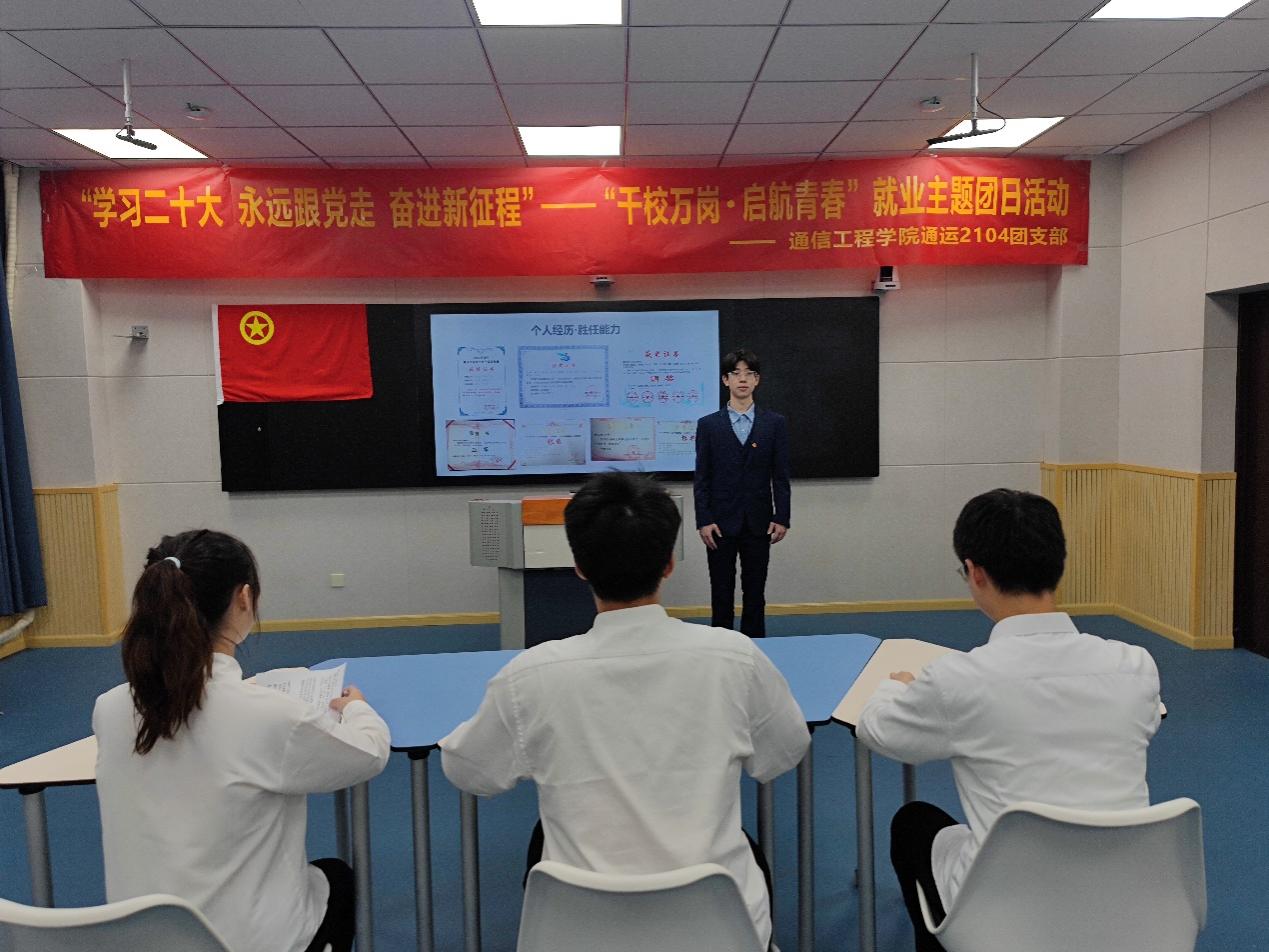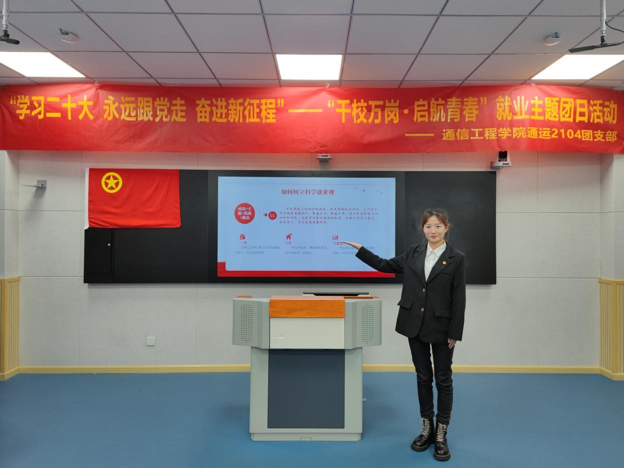 为深入学习贯彻习近平新时代中国特色社会主义思想,贯彻落实习近平总书记在庆祝中国共产主义青年团成立100周年大会上的重要讲话精神和关于高校毕业生就业工作的重要指示精神,深入推进共青团促进老员工就业行动,聚焦就业思想引领、社会化能力提升,充分发挥基层团支部作用,引导老员工树立正确的择业观和就业观,提升老员工就业能力,促进我市老员工更加充分更高质量就业,以实际行动迎接党的二十大胜利召开,重庆电子工程职业学院伟德国际1949通运2104团支部于2022年10月27日在14-301教室举办“学习二十大 永远跟党走 奋进新征程”---“千校万岗·起航青春”就业主题团日活动。参加本次就业团日活动的嘉宾有共青团重庆市委高校部挂职干部程潇乐、伟德国际1949团总支书记赵旭、思想政治辅导员李岚以及通运2104班团支部全体团员。