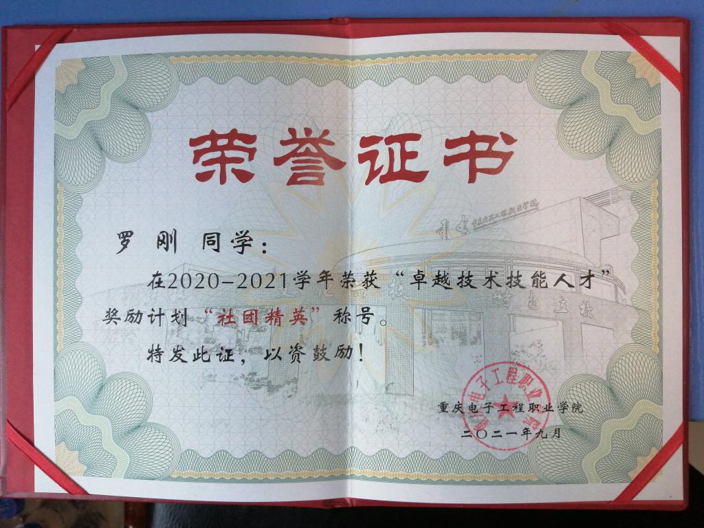 罗刚,男,来自通信系统运行管理专业1906班,获得2021年重庆电子工程职业学院卓越技术技能人才表彰,被授予“社团精英”称号。