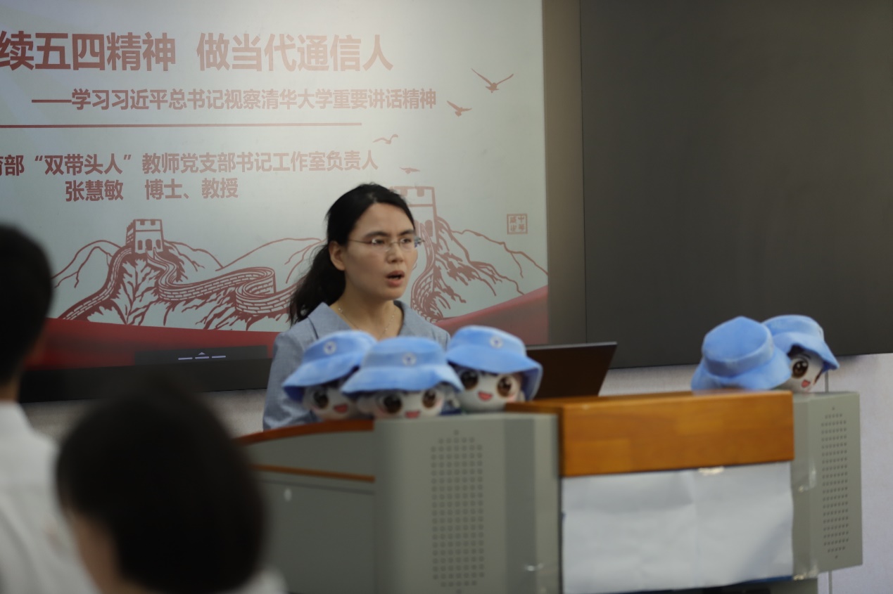 在团日活动中,张慧敏书记开展了以“赓续五四精神,做当代通信人”为题目的讲座,为同学们领学习近平总书记视察清华大学重要讲话精神,和同学们一起深刻领会其中的丰富内涵和重大意义。她根据“与时代同步伐,与人民共命运”的精神要义,提到:同学们作为通信学子要“为‘双高’添彩,做‘5G’精英”。张老师说:“作为当代新青年、通信专业的学子,一定要具有“满腔爱国热情、践行工匠精神、弘扬创新意识”。要立足中华民族伟大复兴战略全局和世界百年未有之大变局,敢于担当,善于作为,为服务国家富强、民族复兴、人民幸福贡献力量。”