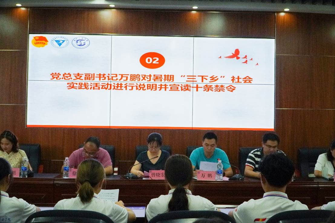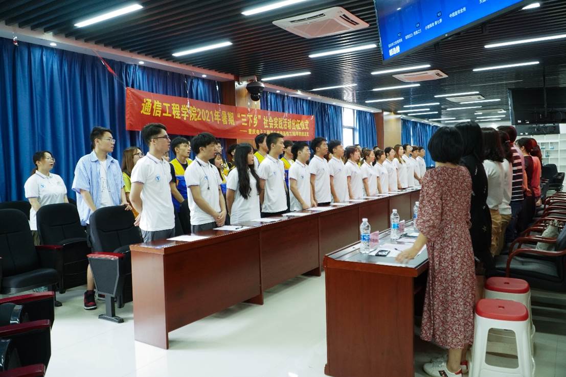 本次出征仪式由通信工程团总支负责人赵旭老师主持,伴随着团歌的响起,本次仪式正式开始。会议上,万鹏副书记介绍了“三下乡”的相关情况,在广泛动员基础上,本院共组建市级、校级重点团队2支,院级重点团队5支,吸引和鼓励同学们围绕党史学习、理论宣讲、国情观察、乡村振兴、民族团结等5个方面开展社会实践活动。此外万鹏副书记还宣读了《重电暑期“三下乡”十条禁令》,要求同学们要严格遵守,一切以安全为重,听从指挥,服从安排,深切的希望同学们能平平安安的去,平平安安的回。