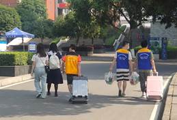 志愿者们顶着35度的高温天气,奔走在往返南门和寝室的路上,为同学们提行李,宣传疫情防控小知识。一天下来,志愿者们虽然身体上感到了些许疲倦,但脸上却始终洋溢着笑容。