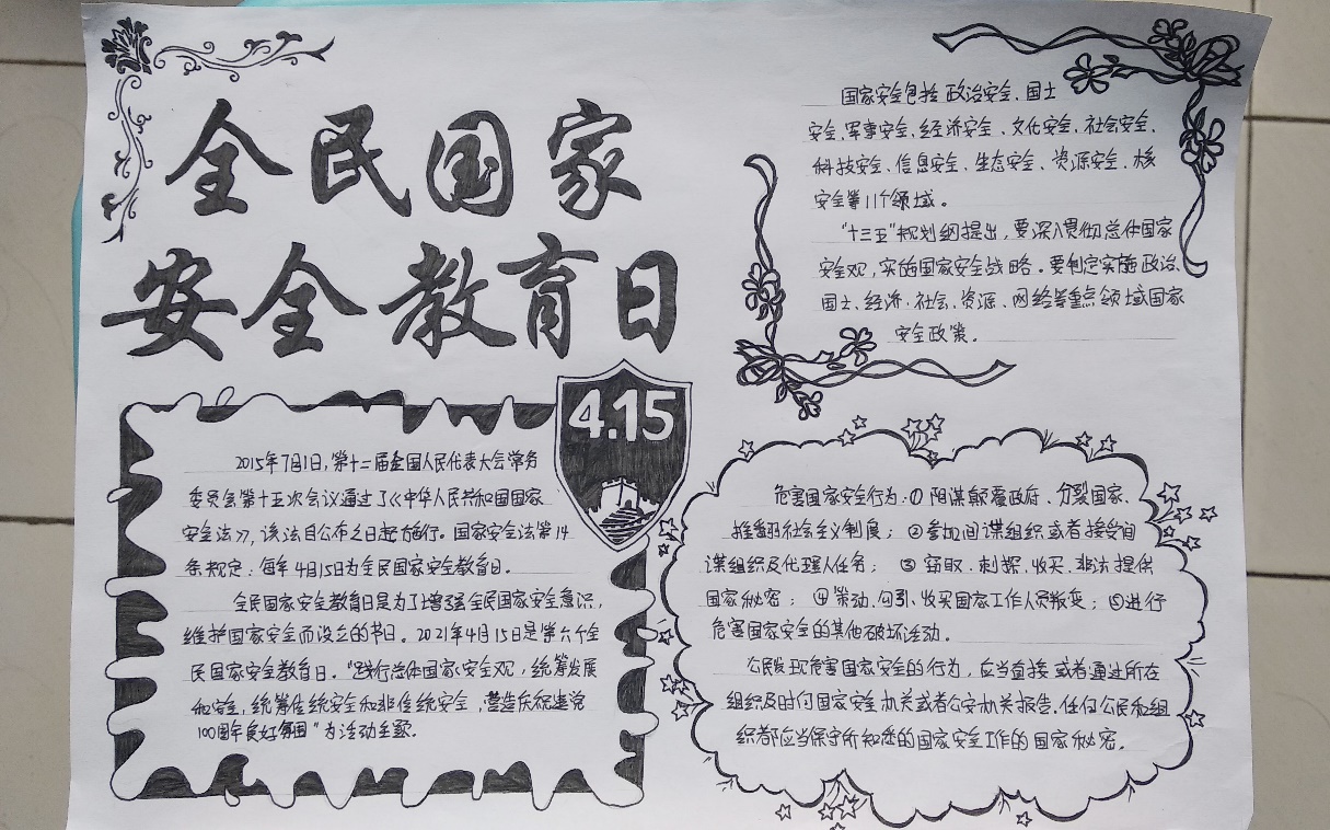 2021年4月15日是第6个全民国家安全教育日。为提高同学们对于全民国家安全法治意识和对新冠肺炎疫情防护的安全教育,对于践行总体国家安全观,统筹发展、传统安全和非传统安全,营造庆祝建党100周年良好氛围。通信工程公司党总支•党员流动服务站特开展本次“全国安全教育日”手抄报主题活动。
