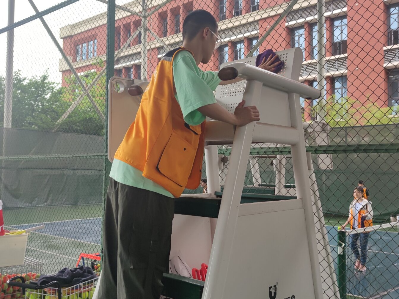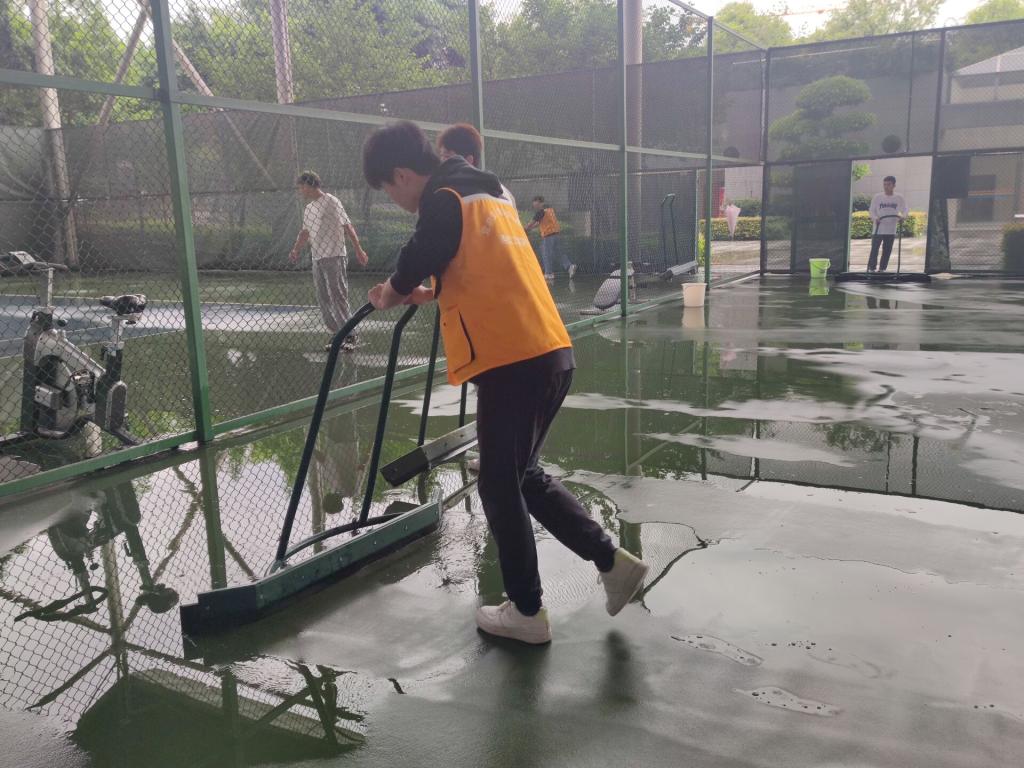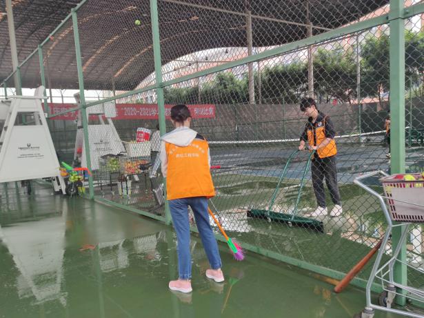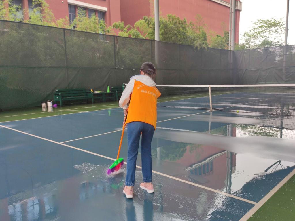 抵达清洁服务现场,同学们各自带着清洁工具,投入到清洁活动中,对网球场进行全面清洁,每个人都分工细致明确,团队配合默契,认真做着分配给自己的任务,经过同学们的勤劳打扫,网球场变得更干净、更整洁。