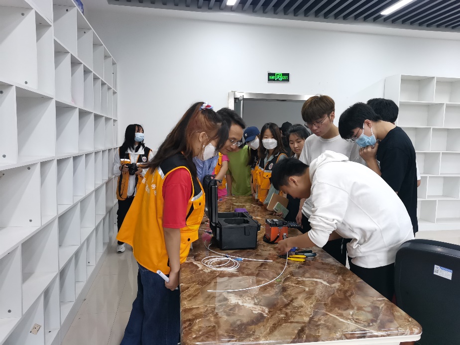 随后,中国电信工作人员和学院老师,向同学们现场演示了光纤熔接过程,并讲解熔接注意事项,现场指导员工进行光纤熔接操作。