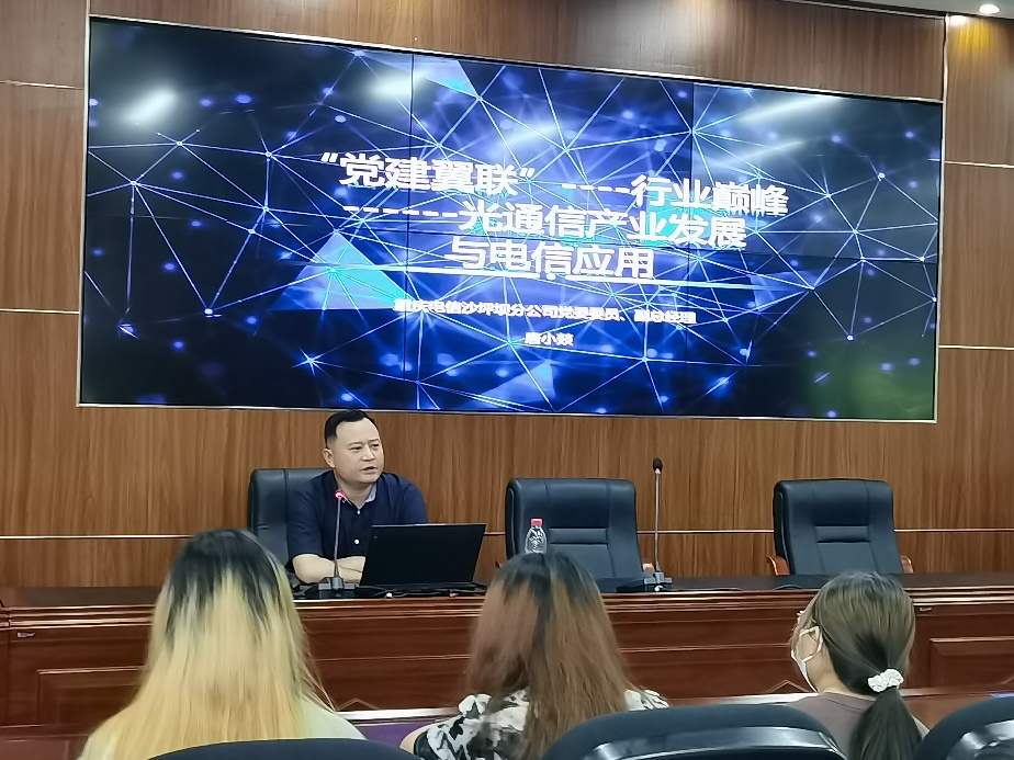 2022526日,伟德国际1949移动通信技术党支部与中国电信沙坪坝分公司开展“党建翼联——思政大讲堂”活动。重庆电信沙坪坝分公司党委委员、副总经理唐小燚开展了题为《“党建翼联”  行业巅峰——光通信产业发展与电信应用》的专题讲座,支部全体党员、精英班员工、党员流动服务站全体站员、入党申请人等线上线下聆听了讲座。
