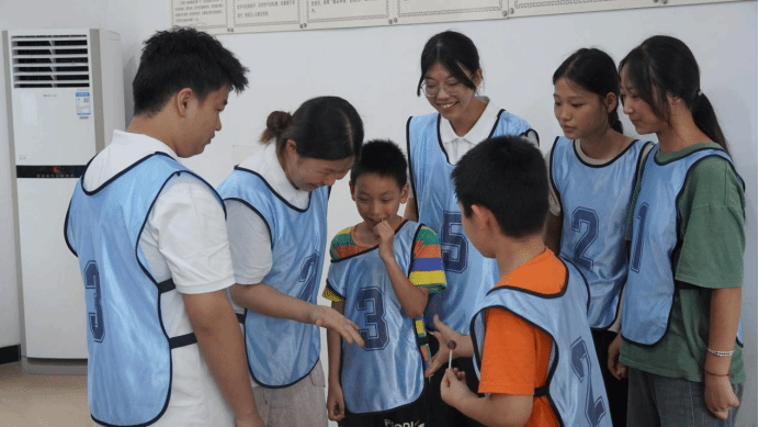 绘画环节告一段落,紧接着是充满趣味的数字游戏。实践团成员们为孩子们穿上了特制的数字马甲,随着主持人的一声令下,孩子们欢快地转动起来。当主持人喊出最终的数字时,孩子们迅速找到自己的搭档,共同完成数字的组合。这个游戏巧妙地融入了基础的数学概念,不仅锻炼了孩子们的计算能力和反应速度,更让他们在游戏中体验到了学习的乐趣。通过这场数字游戏,孩子们不仅提升了思维技巧,也学会了团队合作,共同面对挑战。