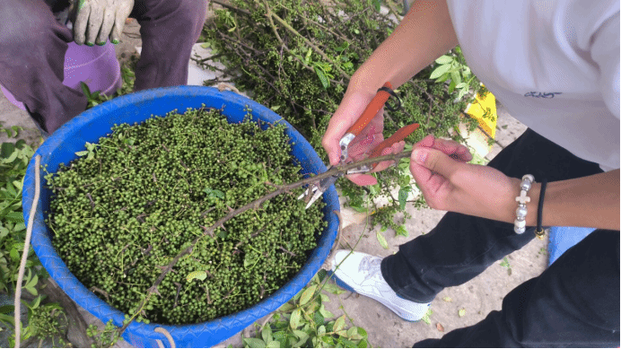 在参观走访过程中,实践团成员们带着满满的求知欲,认真聆听村干部和椒农的讲解。椒农张大爷讲到:“制作干花椒啊,那可是一样工序都不能少哦,首先要先进行花椒采收,晾晒,再装筛送入烘房,烘烤温度要控制在80摄氏度左右,最后筛除杂物,再装袋储存”。看着椒农们人手一把剪刀将花椒从一根一根带刺的花椒树枝上剪下来,动作熟练快速。但当实践团成员们上手体验时,才真正感受到了花椒采收的不易。都说哪来的天生就会的东西啊,那都是椒农们日夜艰辛历练后的成果。通过实地考察,实践团成员们对花椒产业的种植环节有了更直观、更深入的了解。