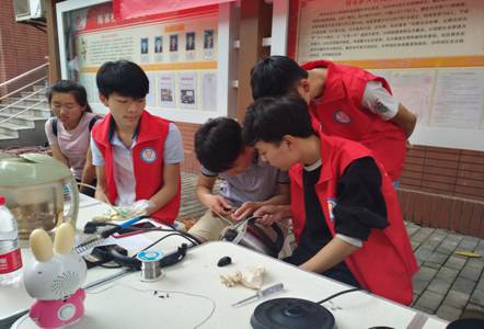 活动现场,居民们陆陆续续拿来不能正常工作的小音响、电热水壶、吹风机,各种小家电摆满了服务台热闹非常。大家都忙碌的换零件、接电线、焊接线路。看见居民们的问题一一被解决,志愿者们也都露出了会心微笑。