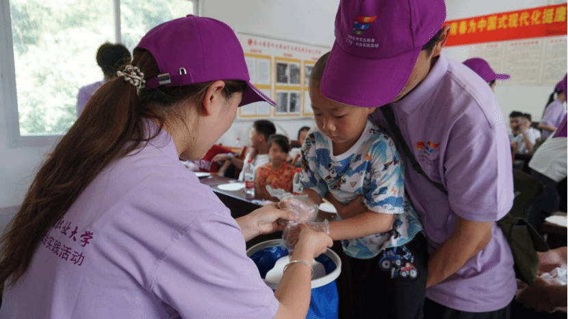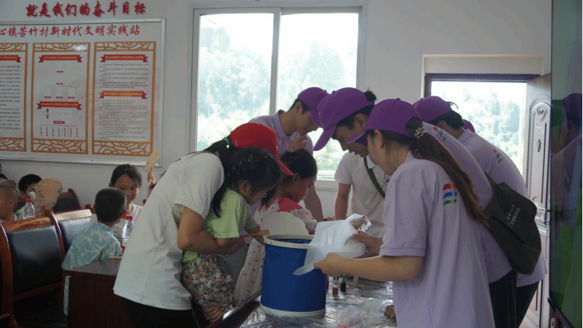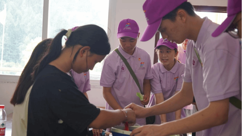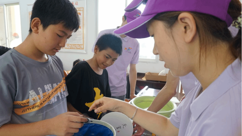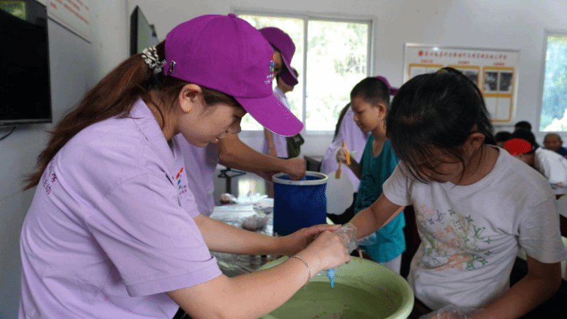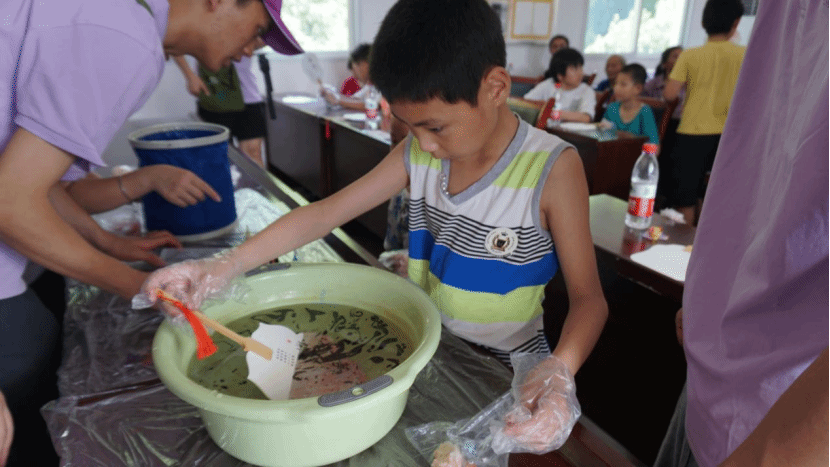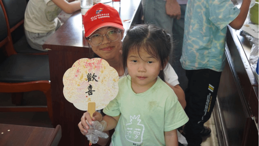 在制作的过程中,实践团的成员们始终保持着耐心、爱心和细心。他们时刻关注着孩子们的进展,及时给予指导和鼓励。当发现有几位略显羞涩、躲在同伴身后的孩子时,他们会用温柔的话语和坚定的眼神给予孩子们力量。这份温暖的邀请,融化了孩子内心的紧张,让他们也勇敢地走上前来体验。当遇到力气小拧不开颜料盖的孩子,成员们会立刻上前,大手包裹着小手,一起用力。对于个头还够不着操作台的小不点,成员们会稳稳地将他抱起,让孩子能清晰地看到水面色彩的变化,并亲手操控扇面浸染的角度。这一刻,“非遗”不再是书本上的名词,而成了孩子们手心能触摸、眼中能看见、心中能感受的真实喜悦。