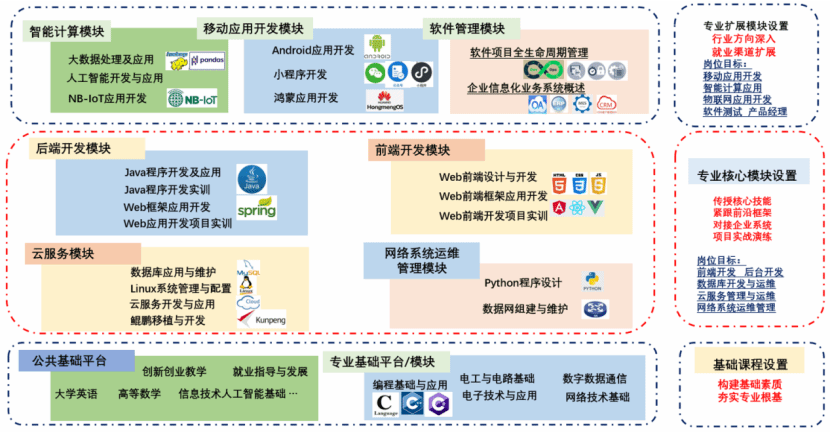 数据网组建与维护、Web前端设计与开发、Web框架应用开发、Web前端框架应用开发、Java程序开发及应用、Python程序设计、Linux系统管理与配置、云服务开发与应用、大数据处理及应用、移动应用开发、小程序开发、鲲鹏移植与开发、鸿蒙应用开发等。课程内容均对接最新技术方向。