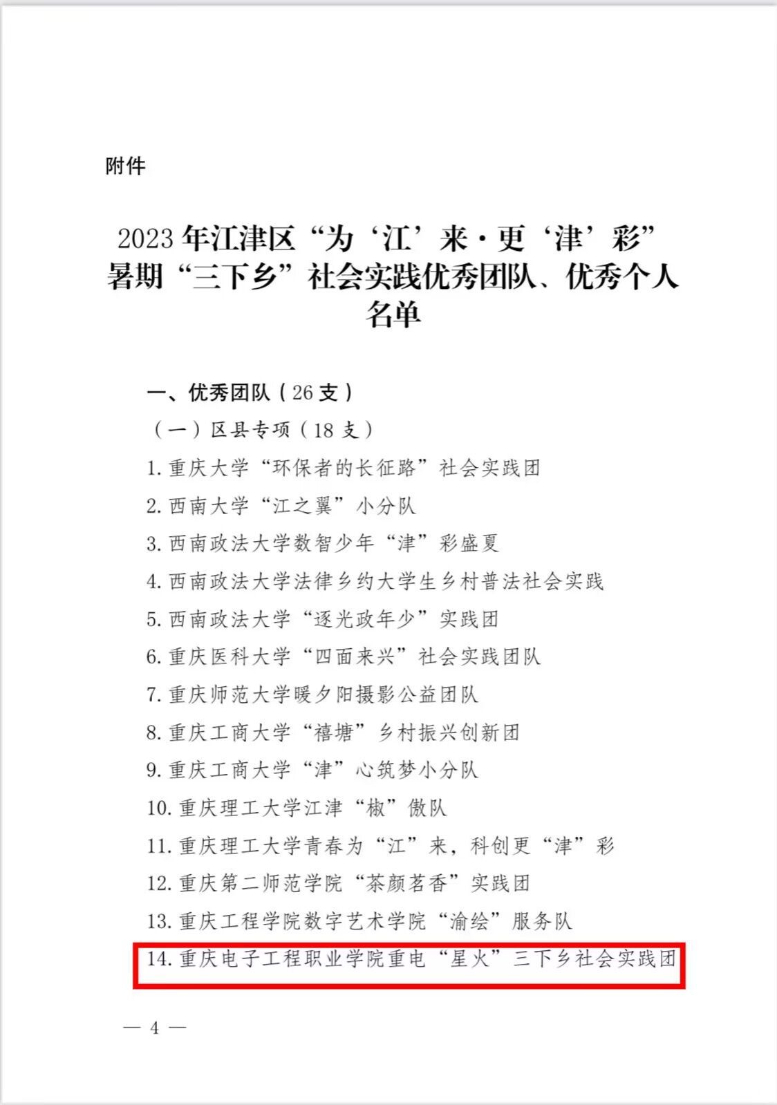 在江津共青团组织开展的2023年江津区“为‘江’来·更‘津’彩”暑期“三下乡”社会实践活动中,重电“星火”三下乡社会实践团荣获优秀团队,3位师生荣获“优秀个人”称号。 2023年江津区“为‘江’来·更‘津’彩”暑期“三下乡”社会实践优秀团队名单 2023年江津区“为‘江’来·更‘津’彩”暑期“三下乡”优秀个人名单 ...