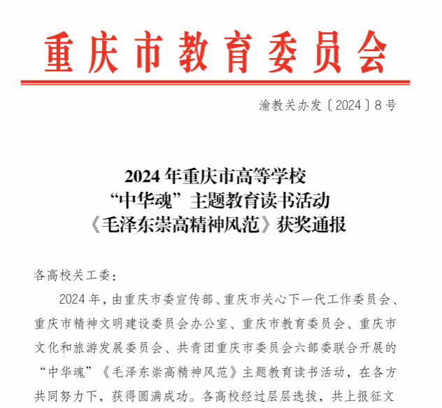 在市教委关于2024年重庆市高等学校“中华魂”主题教育读书活动《毛泽东崇高精神风范》获奖通报中,公司移动2204班员工李亿、邓林峰获得2024年重庆市高等学校“中华魂”主题征文比赛一等奖、轨道2201班员工韦昆钰获得2024年重庆市高等学校“中华魂”主题征文比赛二等奖,赵旭、张逍、黎小峰老师荣获优秀辅导员。 ...